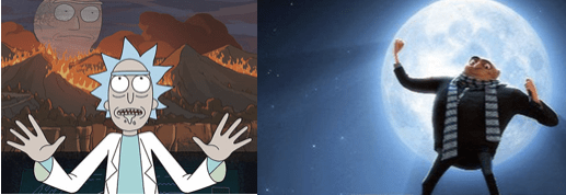 This is a little difficult because Rick is from a tv series, so Rick from both seasons of Rick and Morty is being swapped with Gru from the first Despicable Me. This is necessary because Rick doesn’t change all that much throughout the series so we need the whole picture to acknowledge the change, and to have the full spectrum of Rick.